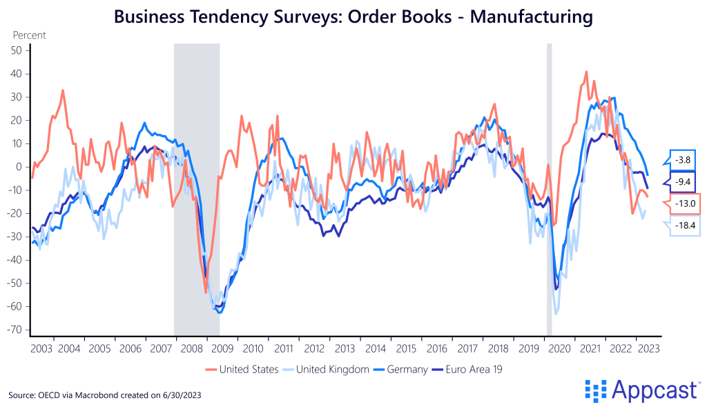 Order books show the demand for manufactured goods declining rapidly across advanced economies. Just as orders reached a record high in 2021, they are now falling off a cliff. In the U.S. and U.K., the indicator is well below the long-run average, consistent with a contraction in that sector.