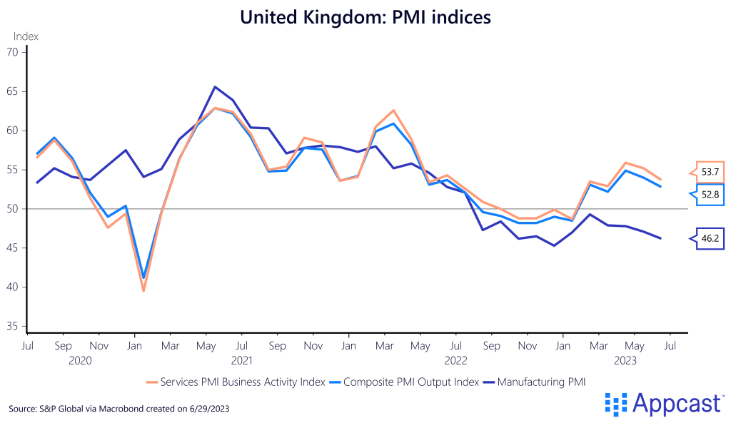 In the U.K., the manufacturing PMI has been below 50 since last summer, showing prolonged weakness, while the service sector expanded in the beginning of 2023.