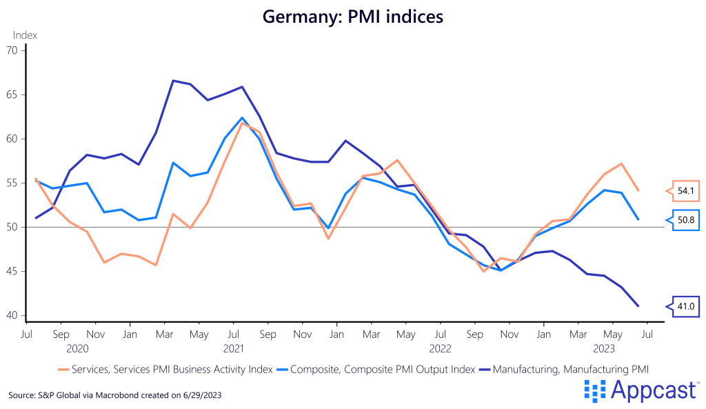 The Purchasing Managers Index (PMI) is survey-based data that indicated whether a particular sector is in expansion territory (values above 50) or contraction territory (values below 50). The data for the U.S., the U.K., and Germany is fairly synchronized, showing the extent to which global economic shocks have dominated since 2020, starting with the pandemic to the global supply chain crisis, the war in Ukraine, and now the global central bank rate hike cycle to combat inflation.