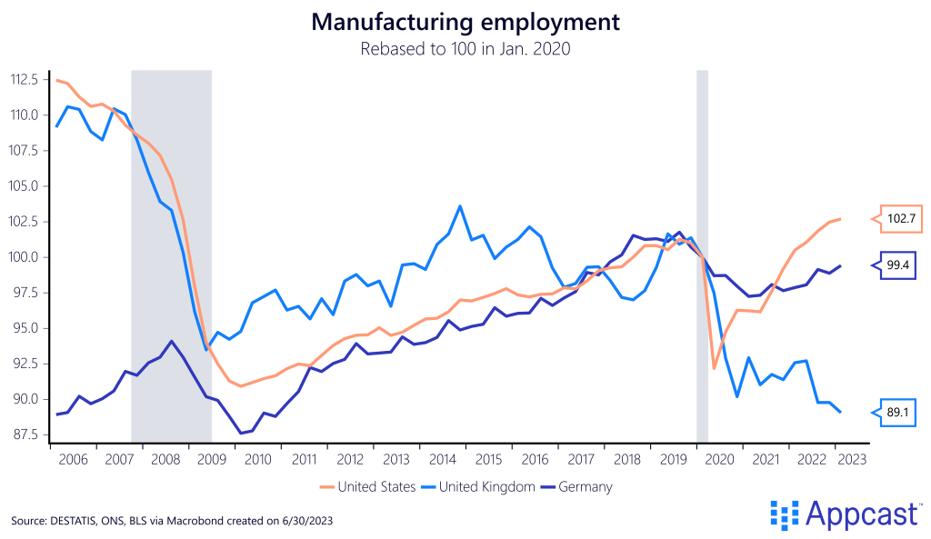 Manufacturing employment fell off a cliff in the U.S. and U.K. during the Great Recession while Germany’s manufacturing employment only fell slightly. During the decade before COVID, both the U.S. and the U.K. have gained back some of those manufacturing jobs even as the previous level from before 2008 is still out of reach.