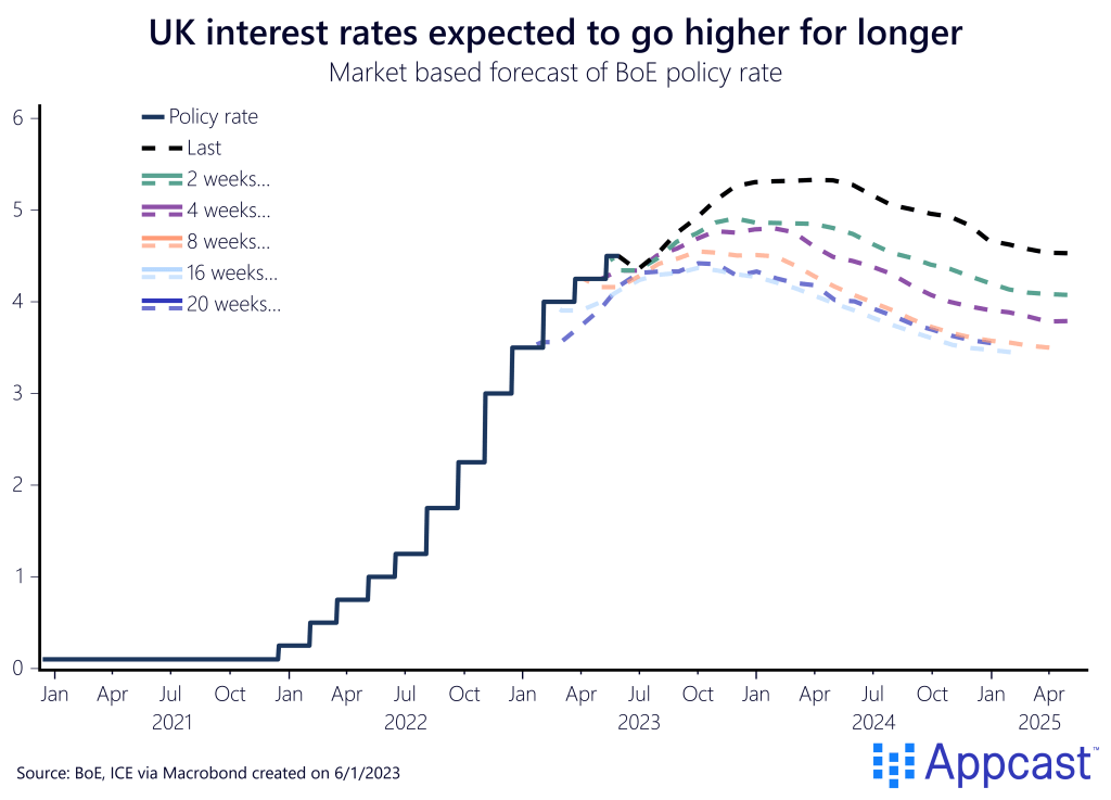 Nominal wage growth is still exceeding 7% in the private sector even as the Bank of England (BoE) increased its policy rate from 0% in January 2022 to 4.5%, the fastest tightening cycle since the 1980s. And markets are now pricing in an even higher peak policy rate of 5.5% and expect the policy rate to remain above 5% throughout 2024, which will put additional pressure on mortgage rates in the U.K.