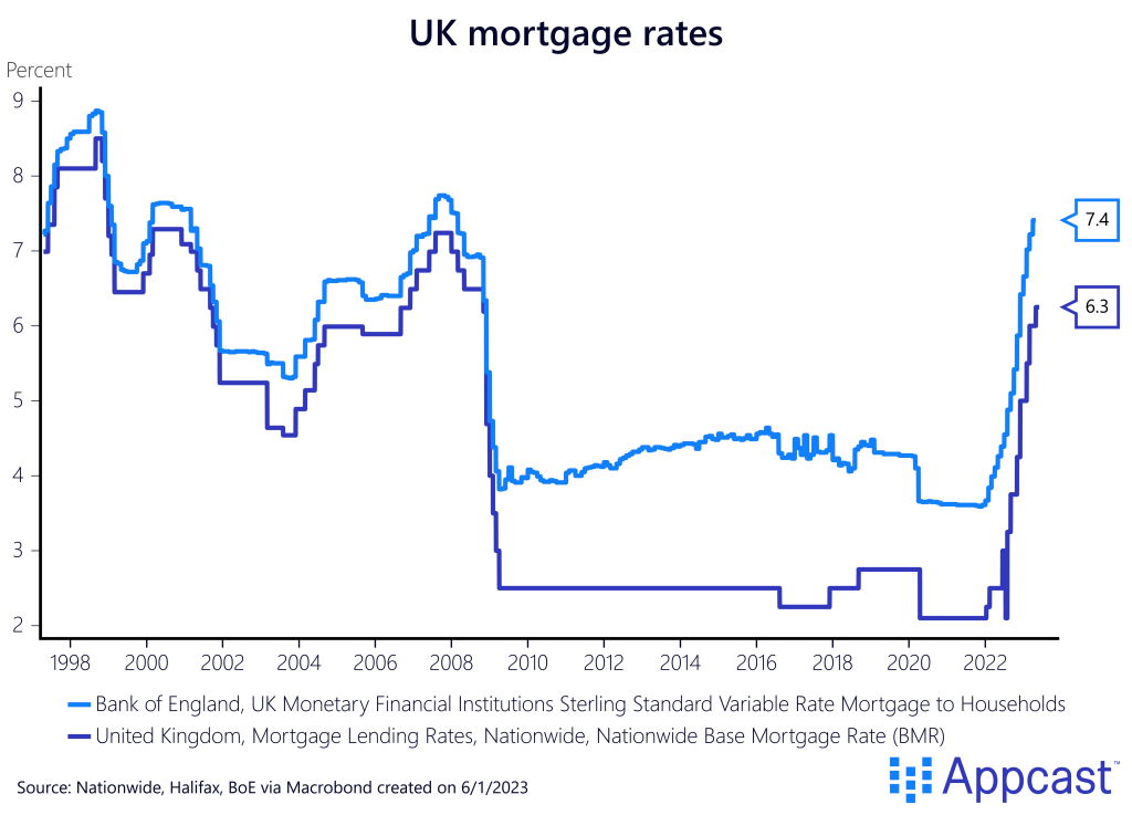 Nationwide, a U.K. building association, has seen its base mortgage rate increase from below 3% in late 2021 to more than 6% right now. The standard variable rate for households is even higher at just under 7.5% right now.