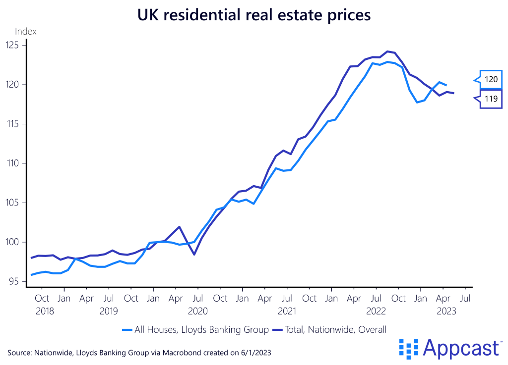 U.K. economic data has come in better than expected in 2023. Even the housing market has held up well, though it remains vulnerable. A significant portion of mortgages will see their rates increase substantially later this year, which could lead to a credit crunch and correction in the housing market.