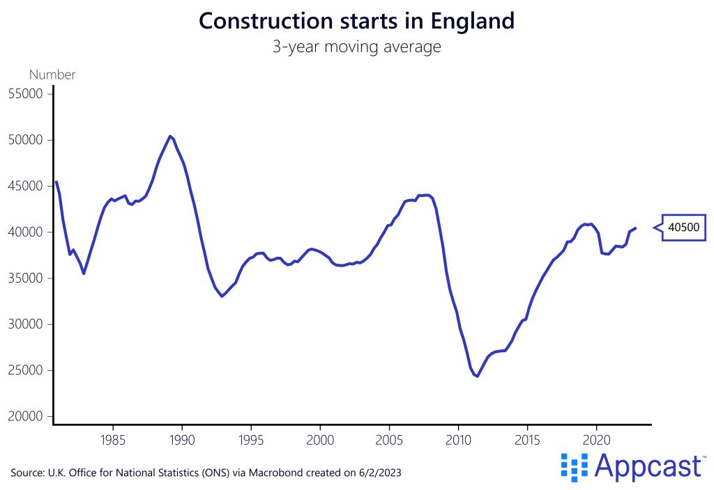 The latest number shows that housing starts in England have been recently higher than just before the pandemic. At the same time, starts are still lower than they were in the 1980s when the population was significantly lower. On a per capita basis, the U.K. has not been building enough housing for decades, and this has driven up real estate prices across the board.