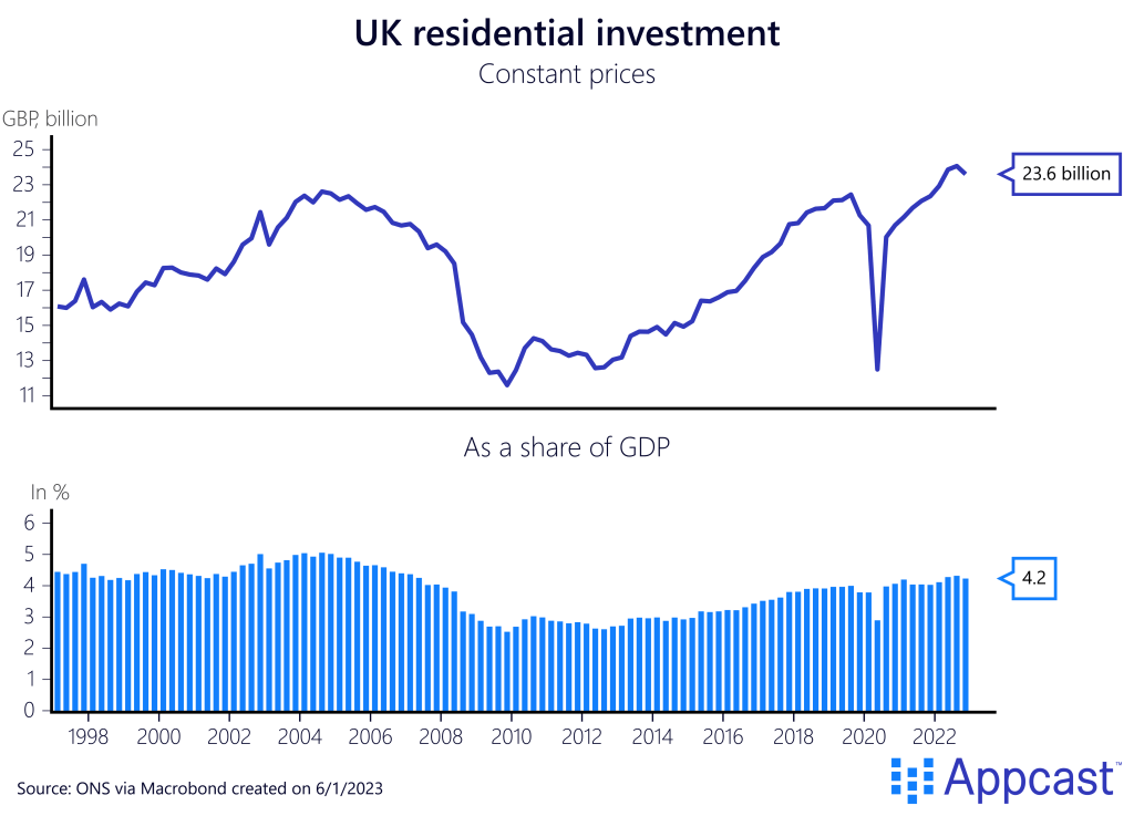 One big concern is that the recent rate hike cycle might not just put a dent into house prices, but also kill off residential investment for a while, which would lead to even less supply in the medium-run and could thus aggravate the U.K.’s unaffordable housing crisis.
