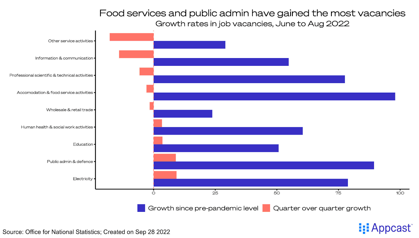 However, signs of easing are starting to show. Job vacancies are falling across the board, especially in the services, tech, and food and accommodation sectors. Recruiters may soon be feeling a cooldown in these challenging conditions.