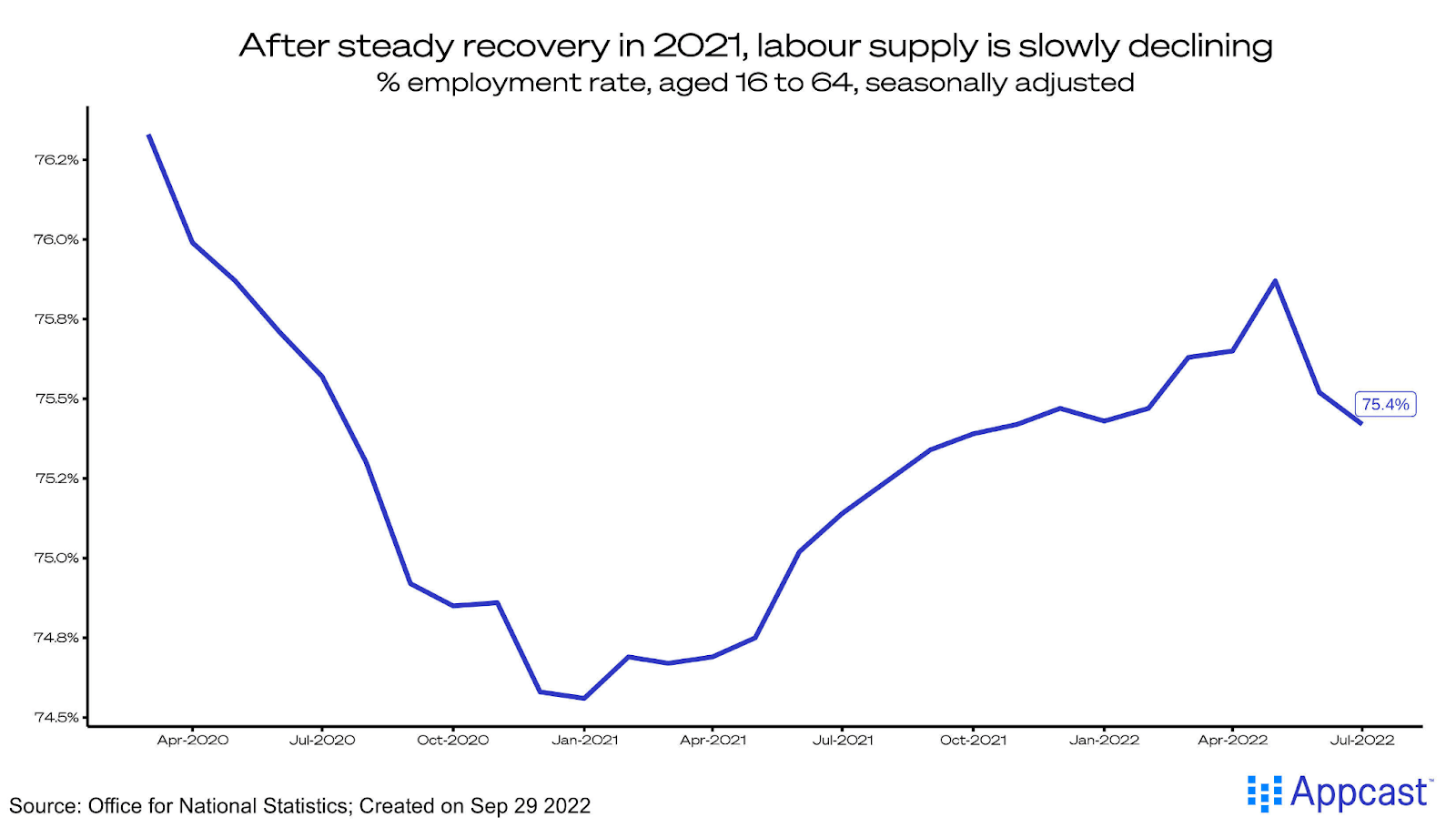 Demand for labour is way up in the U.K. – but job seekers are missing. The post-pandemic jobs recovery faltered as labour supply slipped steadily in 2022. The employment rate has dropped to just 75.4% – way down from pre-pandemic levels and even from earlier this year.