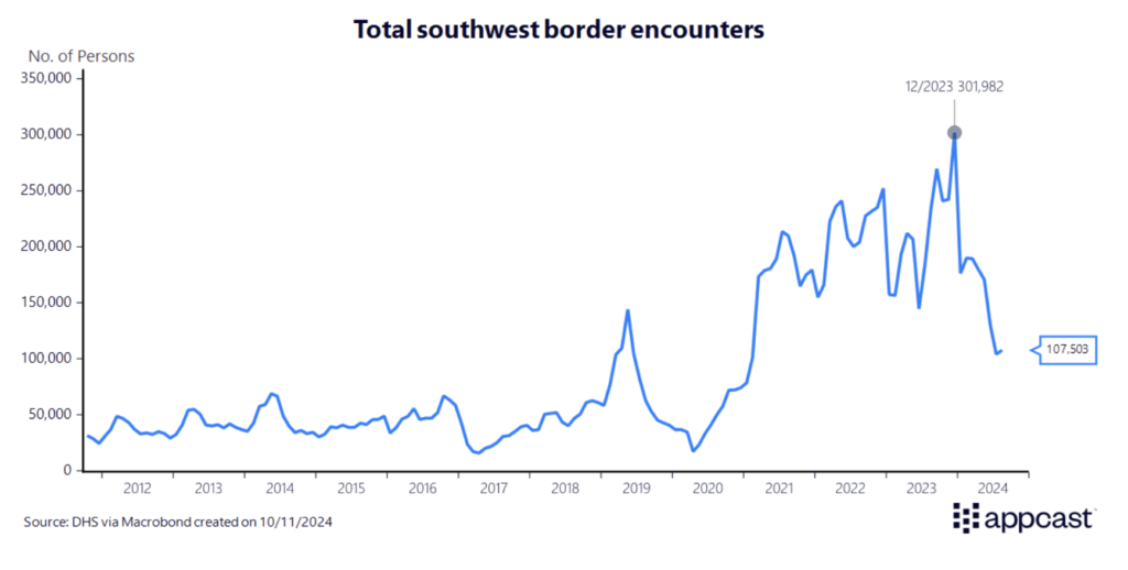 Border encounters reached an all-time high in December of 2023 at nearly 300,000 according to the Department of Homeland Security. This surge in crossings has fueled much of the recent political debate and will ultimately have a large impact on the direction of policy for the rest of the decade.