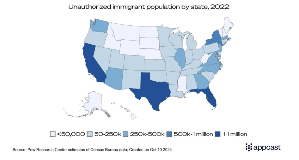 A small number of states have received the largest share of these immigrants, with Florida, Texas, and California alone accounting for more than a third of the total undocumented population. These states, all of which rank among the top four in terms of Gross Domestic Product (GDP), have long relied on both authorized and unauthorized immigrant labor to support key industries such as agriculture, manufacturing, construction and healthcare.