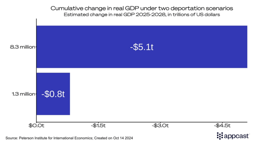 The economic impact in both scenarios is significant. The first model estimates that if 1.3 million workers were removed, the U.S. GDP would shrink by over $800 billion by 2028. In the more extreme scenario, the deportation of 8.3 million workers would lead to a staggering $5 trillion loss in wealth—equivalent to nearly 15% of the total federal debt.