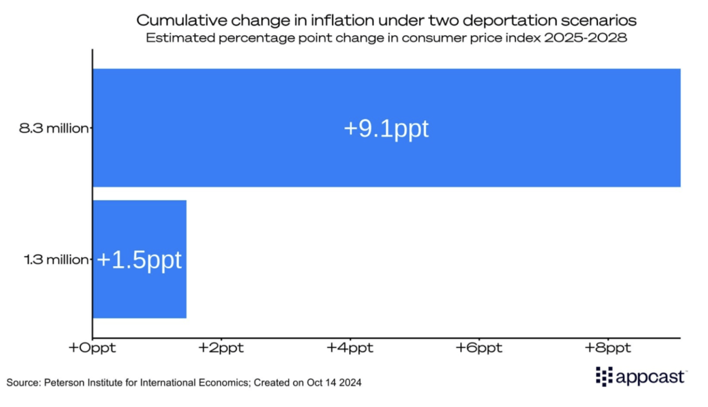 The first scenario uses a low-end baseline of 1.3 million deportations like the Eisenhower administration in the 50s. The second scenario is much more aggressive at 8.3 million—which is the total estimated number of unauthorized immigrants working in the US.