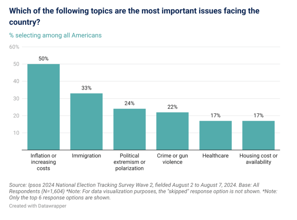 American voters are still grappling with the impacts of pandemic-era inflation, and another bout would surely sour their mood even more. In fact, immigration is not the top issue for this election – it’s the economy. An Ipsos poll from August this year found that 50% of respondents ranked “inflation or increasing costs” as their top priority for the 2024 election.