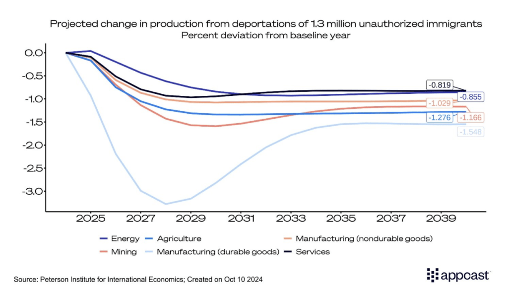 While the economic impact of deportations is significant, certain industries would feel the effects more acutely. In durable goods manufacturing, total production is expected to shrink by nearly $600 billion in the first scenario. Under the more extreme scenario, the loss could reach an astonishing $3.75 trillion.