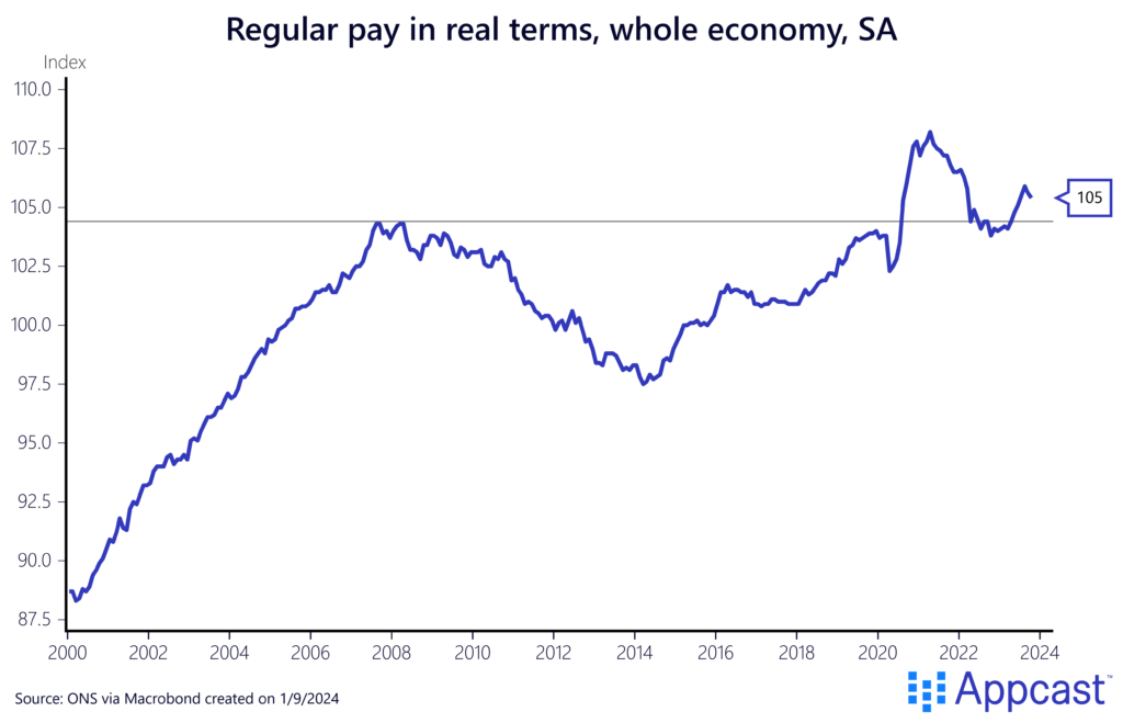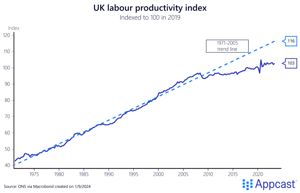 Under previous decades’ trends, labor productivity would be more than 10% higher. That lack of productivity growth has been extremely costly for workers. Average real wages in the U.K. are not much higher than they were in 2006, meaning that we are closing in on the second decade of wage stagnation.