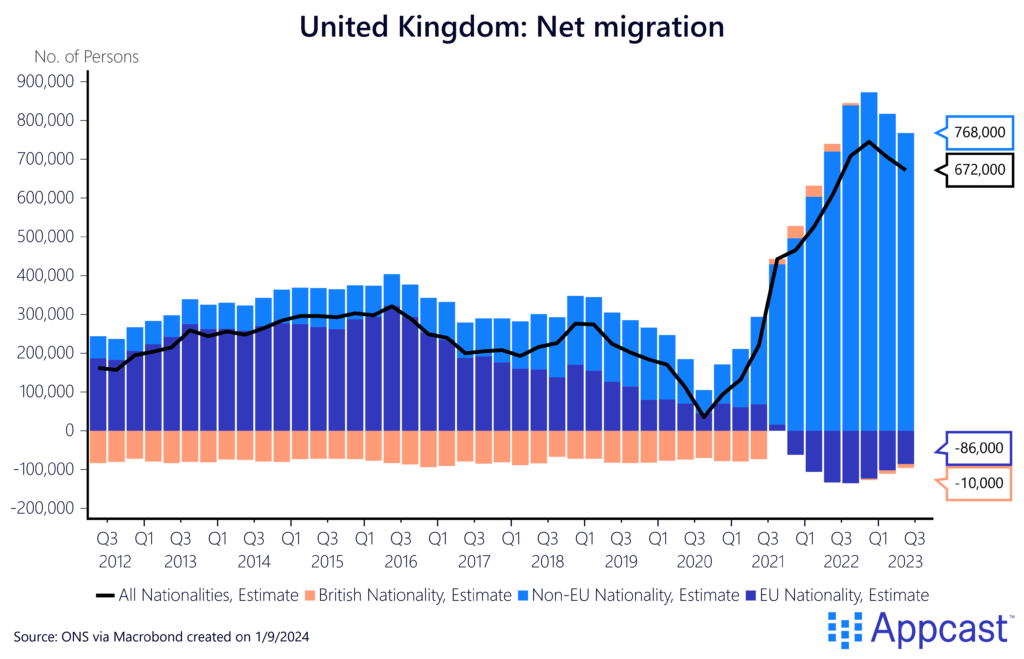 Despite Brexit, the U.K. is currently receiving much more migrants than before the pandemic. Over the last two years, more than 1.2 million people have migrated to the U.K. on net, which is currently leading to a populist backlash at home. In an election year, the government is now desperately trying to restrict inflows even though the additional workforce will be needed in the future.