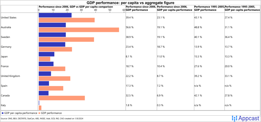 The answer, of course, is that most of the increase is due to population growth. When looking at the aggregate figure, UK economic performance has not been that terrible since 2006 compared to other large, advanced economies: some 22% growth. However, GDP per capita has only increased by a meagre 7% during those 18 years – less than 4% per decade – thus increasing at an almost glacial pace.