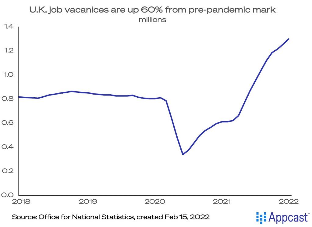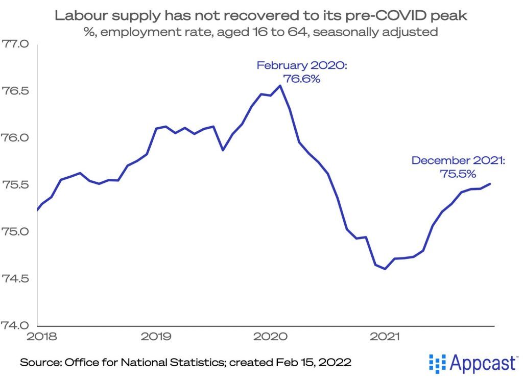 As for the demand-side of the labour market, the latest Office for National Statistics (ONS) data indicate nearly 1.3 million job vacancies in the three-months through January 2022, that is up 60% from its pre-pandemic level. Vacancies are up for nearly all major industries. Employers in the UK report difficulties in acquiring talent across geographies and job functions.