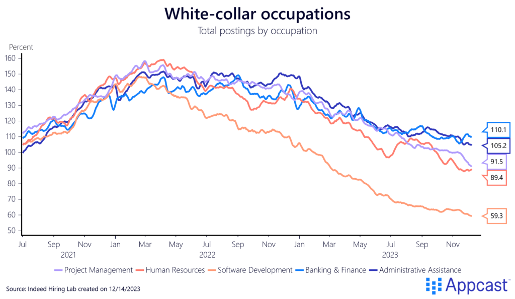 It is especially job postings in white-collar occupations that have slowed down significantly. This has been affecting tech, finance, marketing and media roles.