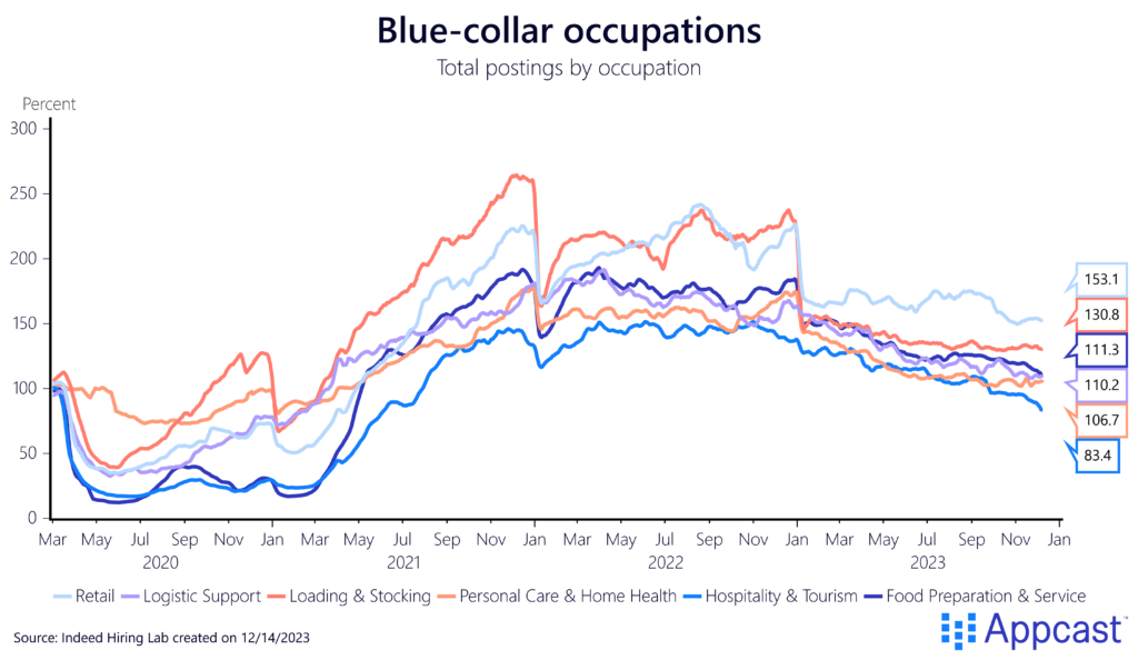 Blue-collar postings, on the other hand, remain elevated. With Brexit, the supply of blue-collar workers coming from Europe has dried up, leading to shortages in many occupations. Older workers and the long-term sick have also left the labor force, aggravating the problem. Therefore, demand for blue-collar workers remains elevated in industries like hospitality.