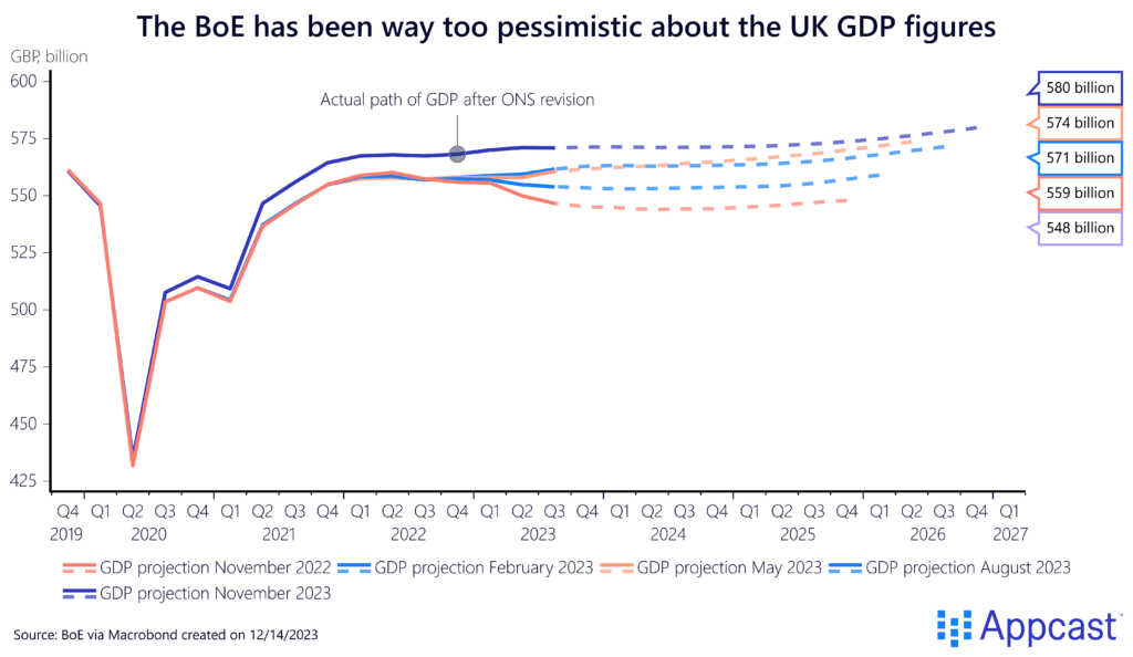 The BoE forecasted a recession at the beginning of this year that has failed to materialize. While the U.K. economy is expanding at a glacial pace, it has continued to grow and defy expectations of an economic contraction.