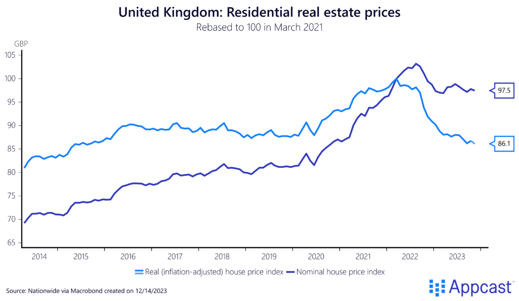 The housing market remains by far one of the largest downside risks for the U.K. economy. While house prices have not gone down significantly in nominal terms, they are down by some 15% in real terms (adjusted for inflation), roughly back at 2019 levels, according to Nationwide figures.