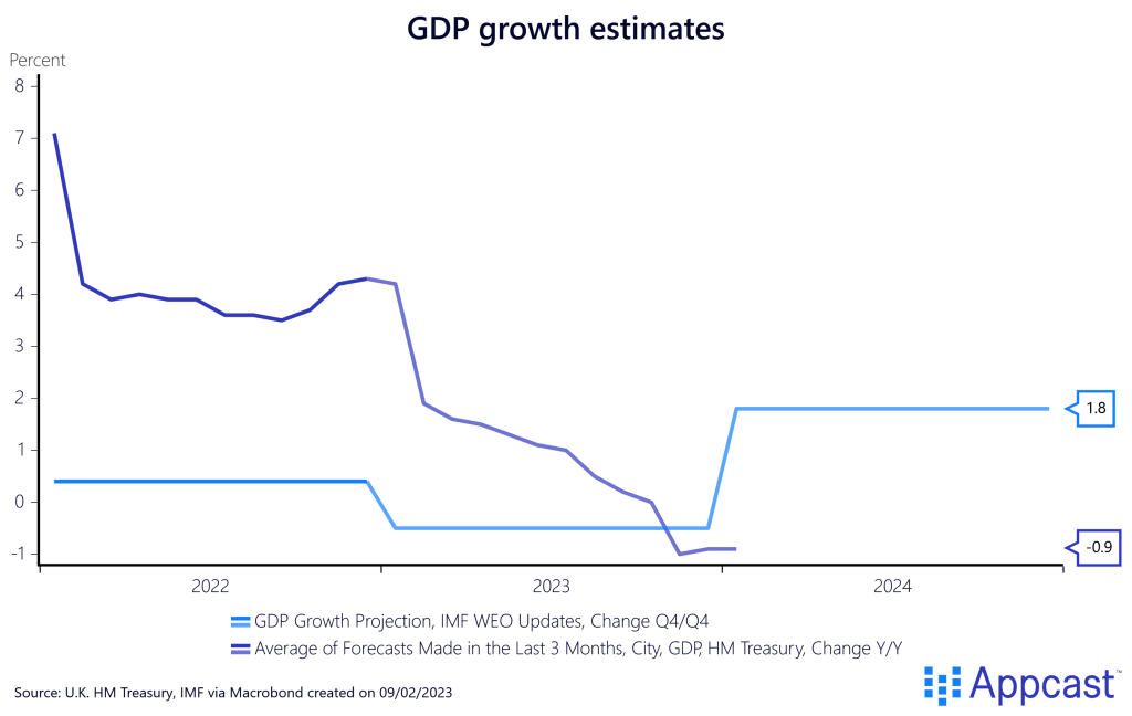 Average forecasts made over the last three months suggest a contraction of a little less than 1% year-on-year by the end of 2023. The IMF is a tad more optimistic but still forecasting negative growth of -0.6% with an economic recovery resuming in 2024.