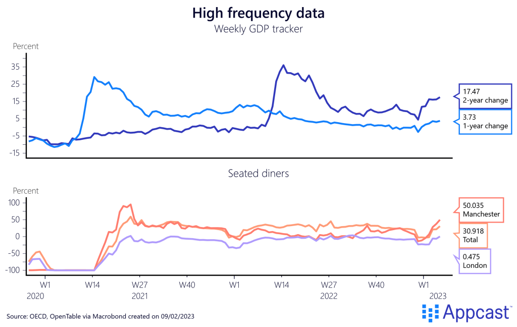 High frequency data, on the other hand, is showing that some sectors of the economy are still doing relatively well. The OECD’s weekly economic indicator uses Google trends data to get an estimate of economic performance in real time. Compared to a year ago, the measure is up by 3%.