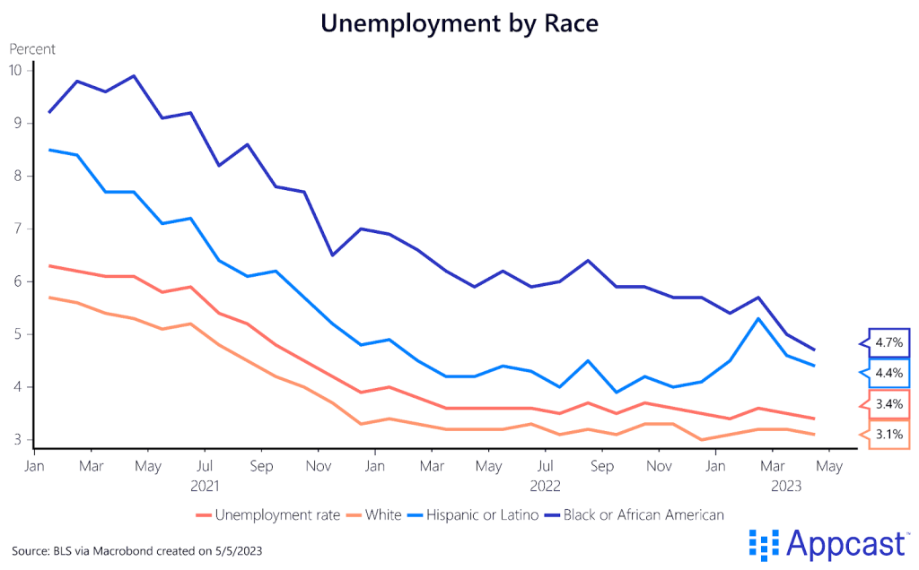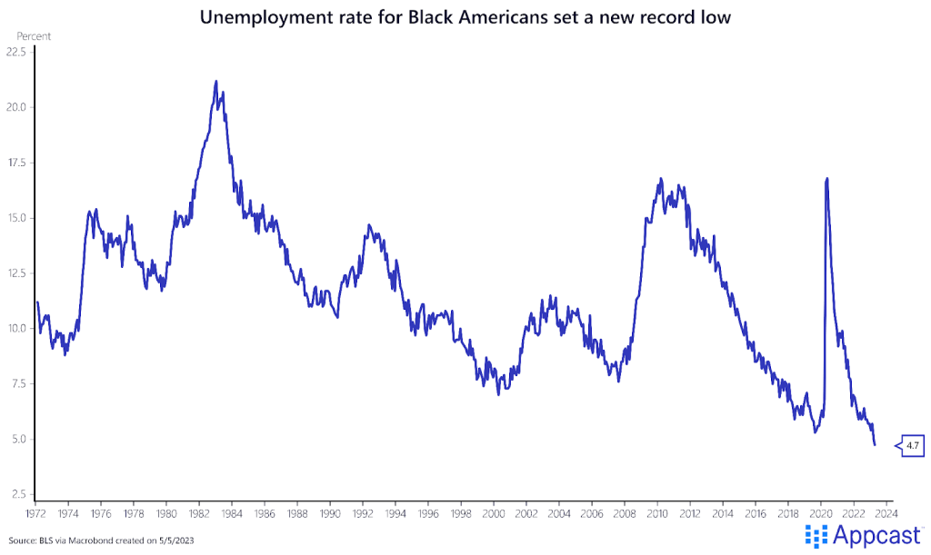 Given this full employment economy, it’s welcome news to see historically disadvantaged groups achieve historic gains. The unemployment rate for Black Americans fell sharply to 4.7%, setting a new low since the beginning of the series in the 1970s. “A rising tide lifts all boats.”