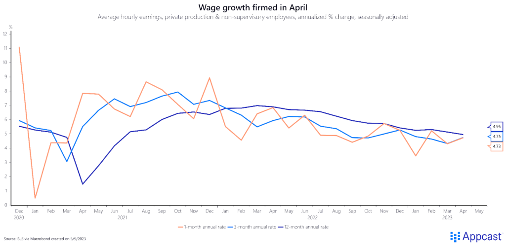 Average hourly earnings, not adjusted for inflation, accelerated slightly in April for private sector non-managers. This is consistent with recent figures from the Employment Cost Index showing wage growth remains elevated. This could be a worrisome sign for the Fed. While earnings growth cooled on a year-over-year basis, the one- and three-month growth rates ticked up to around 4.7% (annual rates). This is clearly inconsistent with 2% inflation.