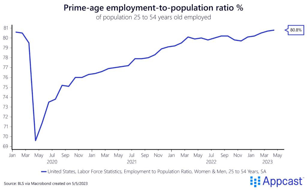 The prime-age employment-to-population (EPOP) ratio rose to 80.8%, above its pre-COVID mark. EPOP is perhaps the best indicator of full employment – a sign that everyone who wants a job can get one.