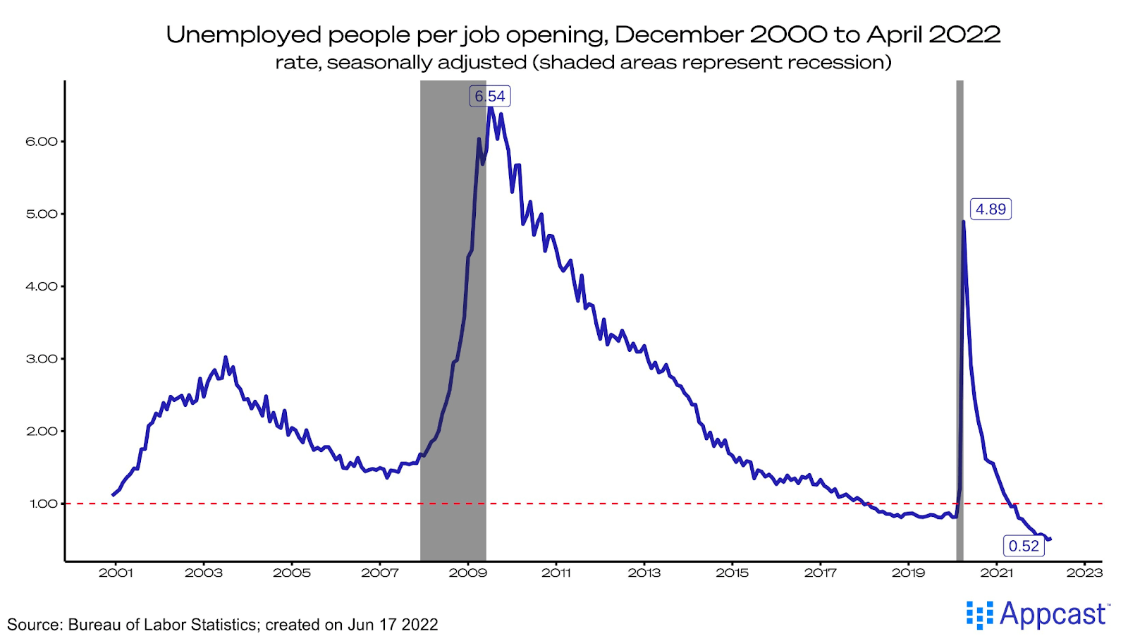 The consistent dip below 1.0 since mid-2021 signals an incredibly tight labor market. If job openings begin to cool, or the number of unemployed people rises, this ratio would increase. Until that occurs, we will continue to be in the midst of a very challenging hiring landscape.