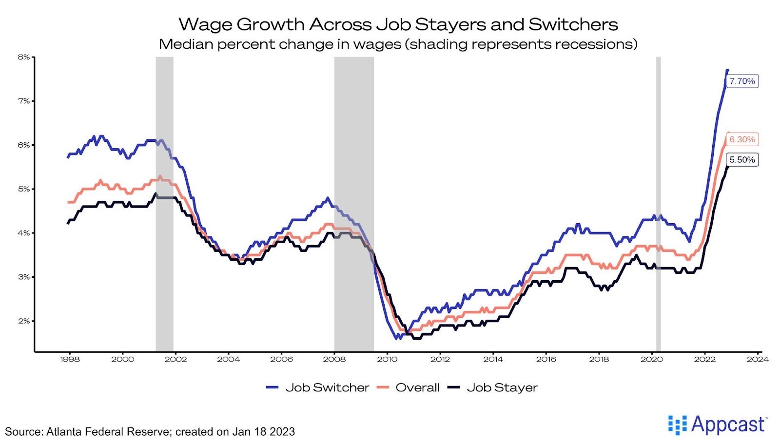 It’s not just low-wage workers who have seen strong nominal wage gains. Spurred by the so-called “Great Resignation,” job-switchers are notching impressive pay increases as well. Job switchers have dramatically outperformed job stayers in wage growth. From December 2020 to December 2022, the gap between the two widened by 1.1 percentage points.