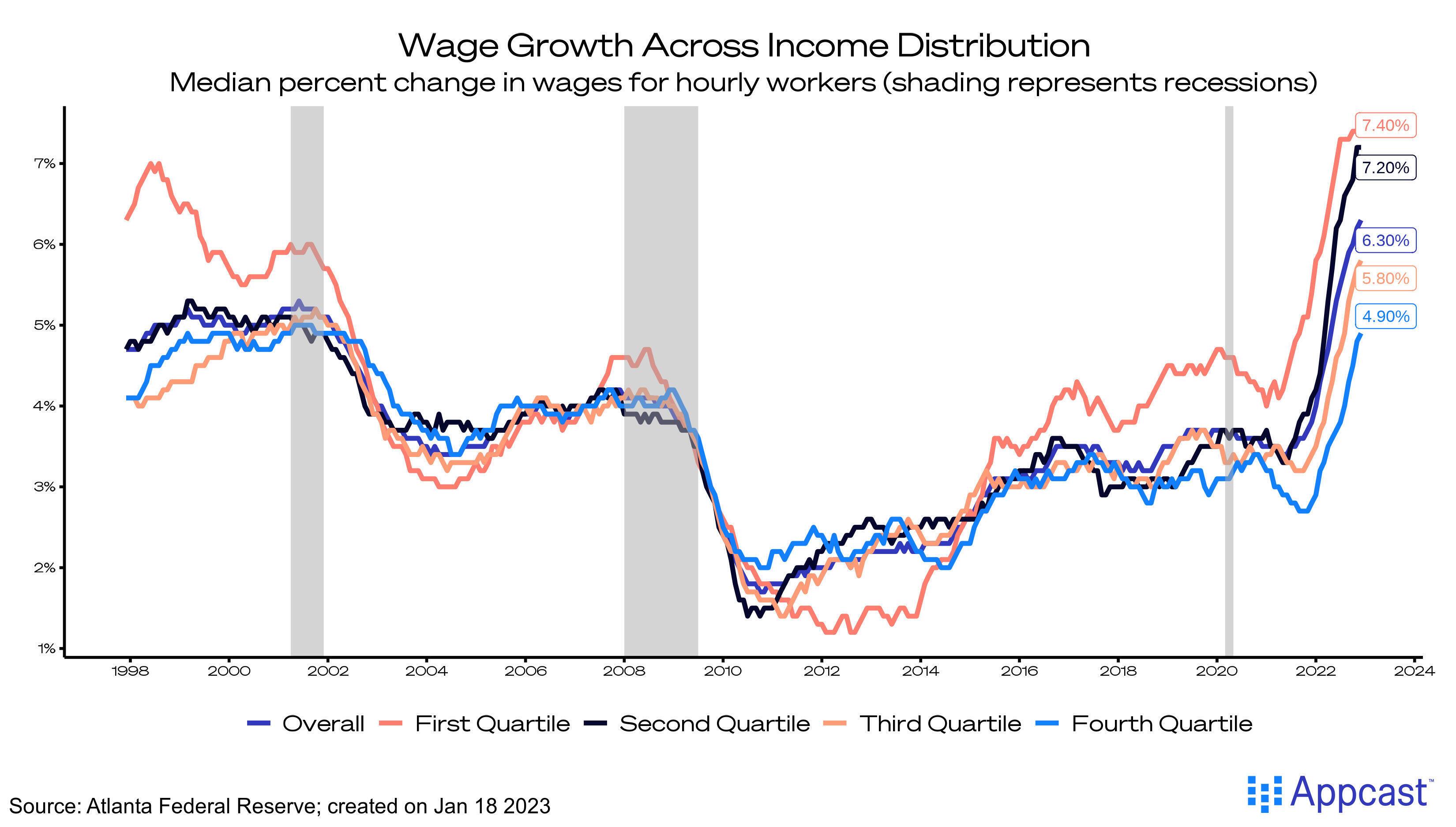 As the Fed continues to hike interest rates to fight inflation, the competition for workers may decrease, slowing these wage gains. So far though, the decreased demand for workers has mostly hit white-collar professions. Intense competition for workers may continue in these lower-earning professions, allowing these historic nominal gains to continue.