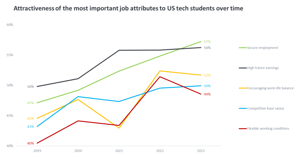 The layoffs hitting the technology sector this past year, especially among the big tech players, have imprinted on the sentiments of tech graduates entering the job market. For a group that has historically prioritized salary above all else, 2023 marks a turning point with job security taking first position as the most attractive job attribute. A year of witnessing the mass layoffs hitting companies (especially potential employers) has planted a seed of doubt in the minds of tech students getting ready to enter the workforce. Gaining employment with their dream employer and having the sense of security that their job will still exist down the road is now what is on the top of their minds. Big players in the technology sphere such as Google, Apple, Netflix, Tesla, and Meta still rank among the top employers for American tech students in Universum’s computer science rankings. However, their hold on the proportion of the vote is diminishing.