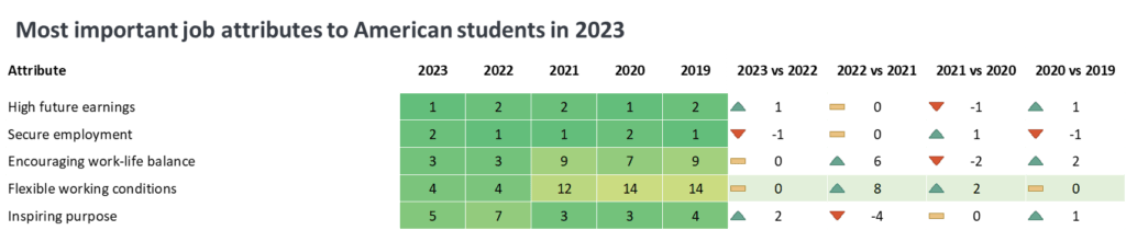 These results have identified the job attributes that entice American students the most when considering their future careers. Perhaps it’s no surprise, but the most sought-after attributes of a job’s attractiveness for American students are high future pay and job security. After major gains in 2022, sentiments around work-life balance and flexibility in their working schedules remain very strong for American students. The growing preference towards these two specific attributes showcase may suggest a bit of a shift in the mindset around the “hustle culture” in the American workforce. This latest wave of young workers is pausing to consider the aspects of a job that can positively affect their well-being, more so than those students immediately before them. Perhaps these preferences stem from the COVID-19 pandemic and its disruption of the typical work environment.