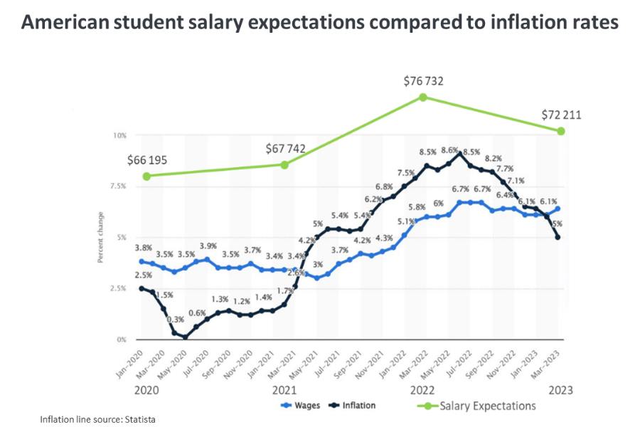 In 2022, American students’ salary expectations increased by 13%, reaching an average of just under $77,000 annually. The most recent results for 2023 show an average salary expectation of $72,000 annually, which is a decrease of 6% from those previous expectations. These results share a similar trend line with the movement of inflation in the United States the past couple years. Salary expectations spiked in response to the sudden shock of rapidly increasing inflation rates but have begun to stabilize as inflation rates begin to subside. When inflation’s nasty impacts are felt, people will naturally eye their salaries and wonder how much higher they would need to be to alleviate the pain.