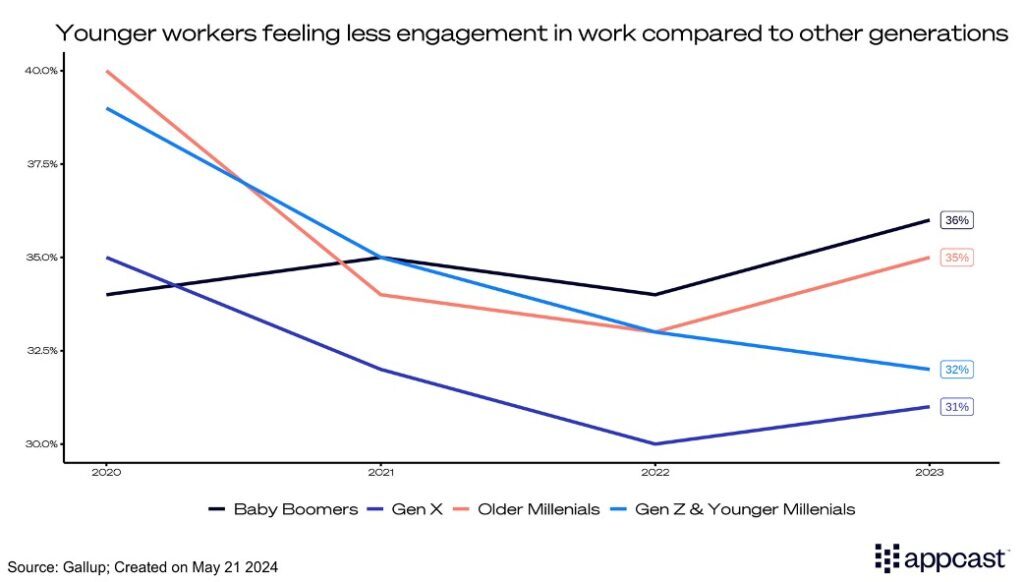 They may be moving into a labor market stronger than those of past generations, but the outlook is less rosy for the youngest set of workers, who are often underemployed. Crucially, Gen Z workers are feeling less engaged in their work compared to other generations. This may stem from an emphasis on work-life balance in recent years, this generation’s penchant for hybrid work, or the general malaise surrounding them as they enter the workforce.