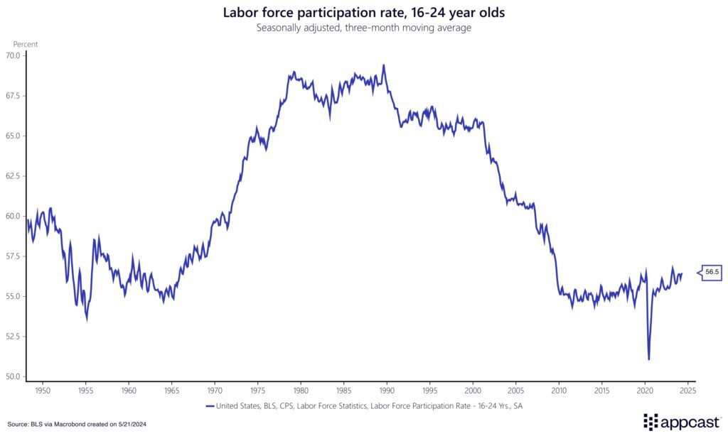 Finally, as we look at today’s labor market, we see that Gen Z exists in one of the most generous job markets of the last 75 years. Unemployment has been enduringly low, now at just 3.9%. Of course, if you look at the unemployment rate for recent college graduates, as the Federal Reserve of New York does, you’ll see a slightly higher value of 4.7%, higher than pre-pandemic norms and higher than it was in the late 1990s (the best labor market). It will always be more difficult for young workers to compete with more experienced workers, even in a strong jobs market like today’s.