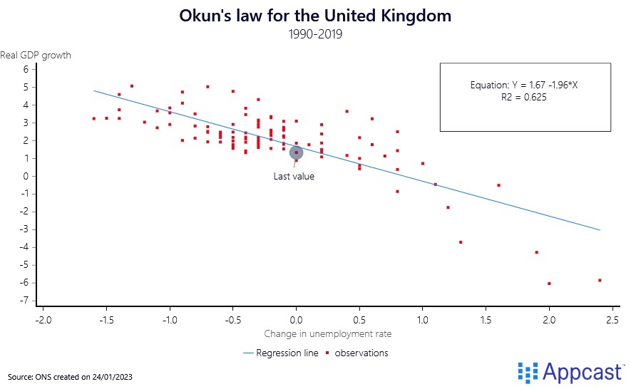 The chart below plots the relationship between economic growth and unemployment – what economists refer to as Okun’s law. What this scatterplot shows is that historically in the U.K. a one percentage point decline in GDP growth has been associated with about half a percentage point increase in the unemployment rate.