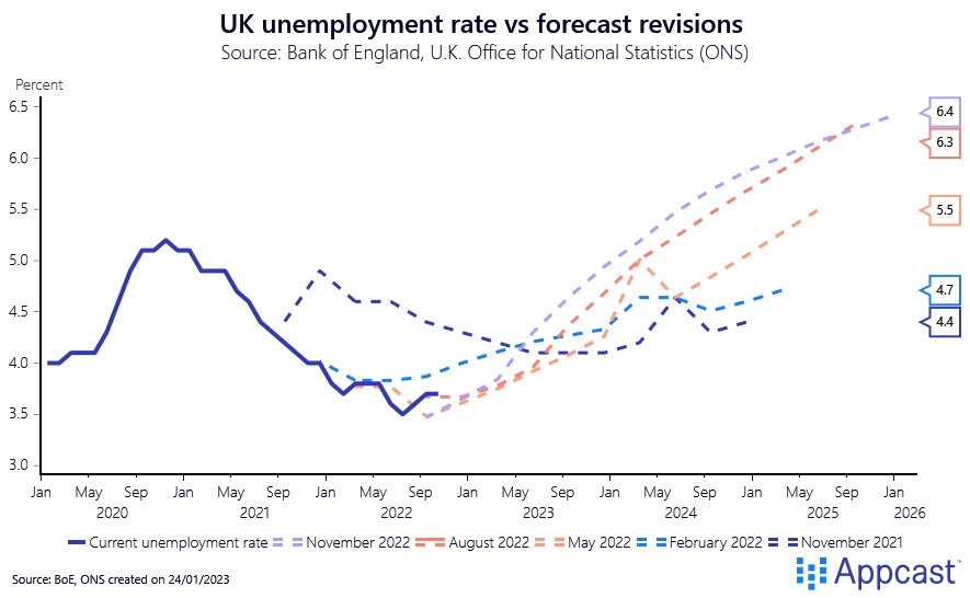 The BoE’s assessment has become increasingly pessimistic over time, now assuming a peak unemployment rate of more than 6.5% in 2025 compared to the November 2021 forecast, which assumed a peak of less than 4.5%.