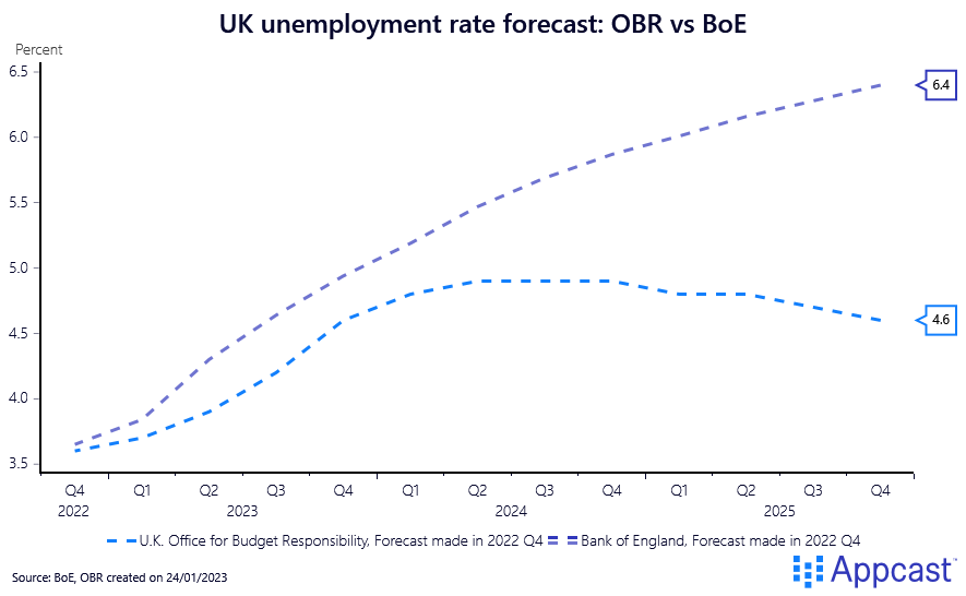 According to the OBR, unemployment will only rise by more than one percentage point during the 2023 recession and peak at about 5% in early 2024, with a subsequent small decline thereafter.
