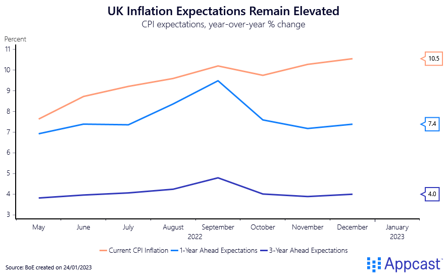 Why? One reason might be that short-run inflation expectations are still shockingly high. This is certainly frightening the monetary policy committee, and as of now the BoE seems to believe that creating a recession is the only way forward to bring those numbers down.