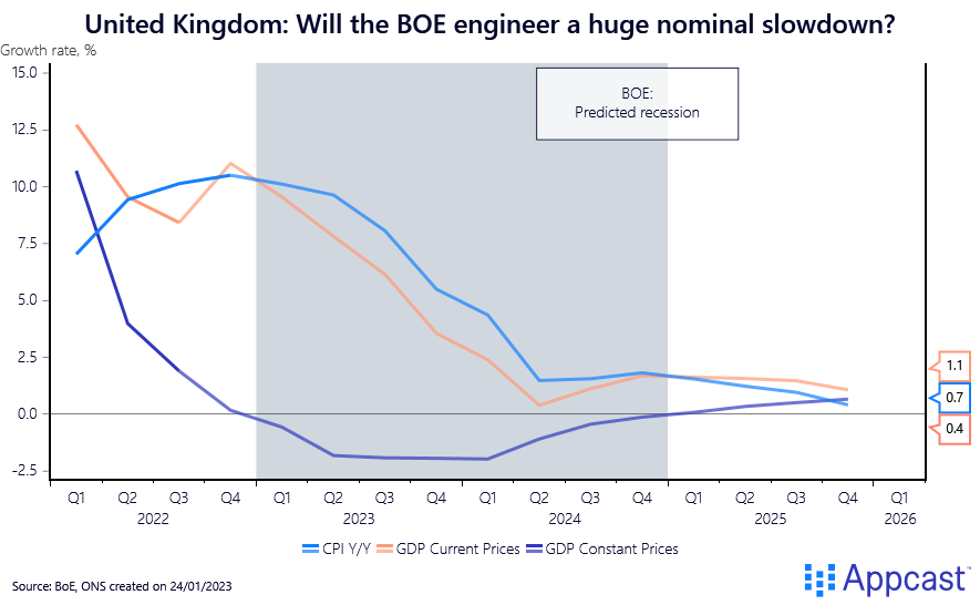 How can we square those two widely differing forecasts? Well, the BoE is also much more pessimistic about the growth outlook. The Central Bank assumes both a steeper and longer recession – lasting a full six quarters – followed by a very timid recovery with real GDP growth remaining below 0.5% until mid-2025.