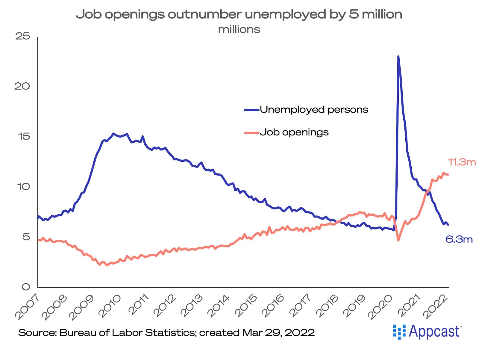 This has created the fundamental imbalance in the labor market: demand outstripping supply. One (albeit crude) way to visualize this is to compare levels of job openings to levels of unemployed persons. Among economists, this metric is often expressed as a ratio but the visualization of the levels is useful in telling us a story about the US labor market over the last 20 years. Simply put, the number of job openings outnumber the unemployed by 5 million (11.3 vs. 6.3) through February 2022. That is the widest gap on record (JOLTS data began in 2001).