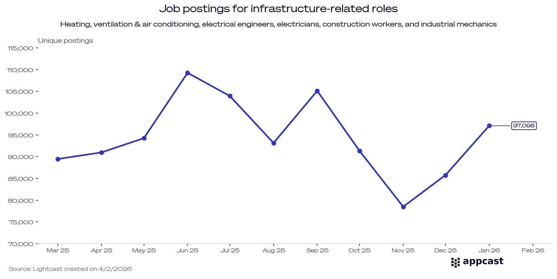 Many of the industries experiencing increased investment in AI infrastructure have relatively small labor pools, limited training capacity, or historically lower levels of interest. As demand rises rapidly, local labor markets are struggling to keep up. This imbalance shows up in several ways, like longer time-to-fill, higher volumes of job postings, and increased competition among employers for a limited set of candidates.
