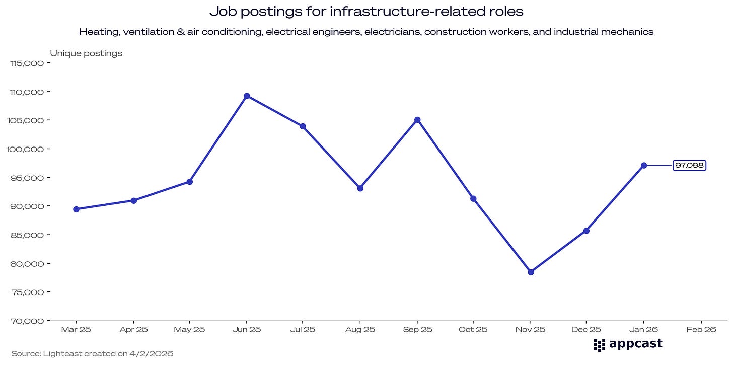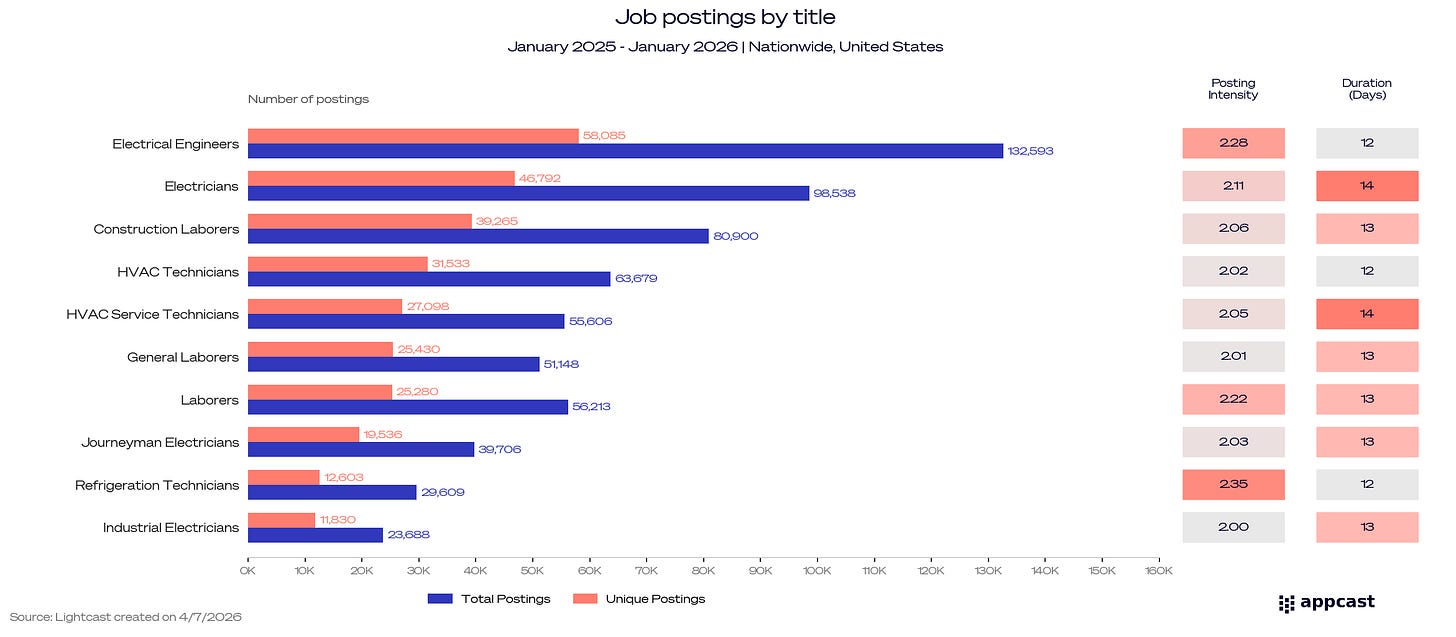 The chart below shows how hiring interest has surged across infrastructure-related roles, with electricians, HVAC (Heating, Ventilation & Air Conditioning) technicians, electrical engineers, construction workers, and industrial mechanics leading in both total and unique job postings. The far-right columns (posting intensity and duration) highlight an important dynamic: roles with higher posting intensity (which indicates how heavily employers are leaning on geographic and title expansions) and longer time-to-fill signal persistent hiring difficulty. In other words, employers aren’t just hiring more — they’re also often struggling to fill these positions.