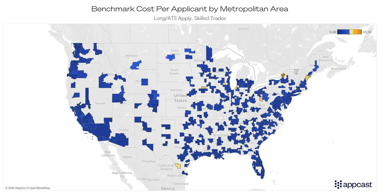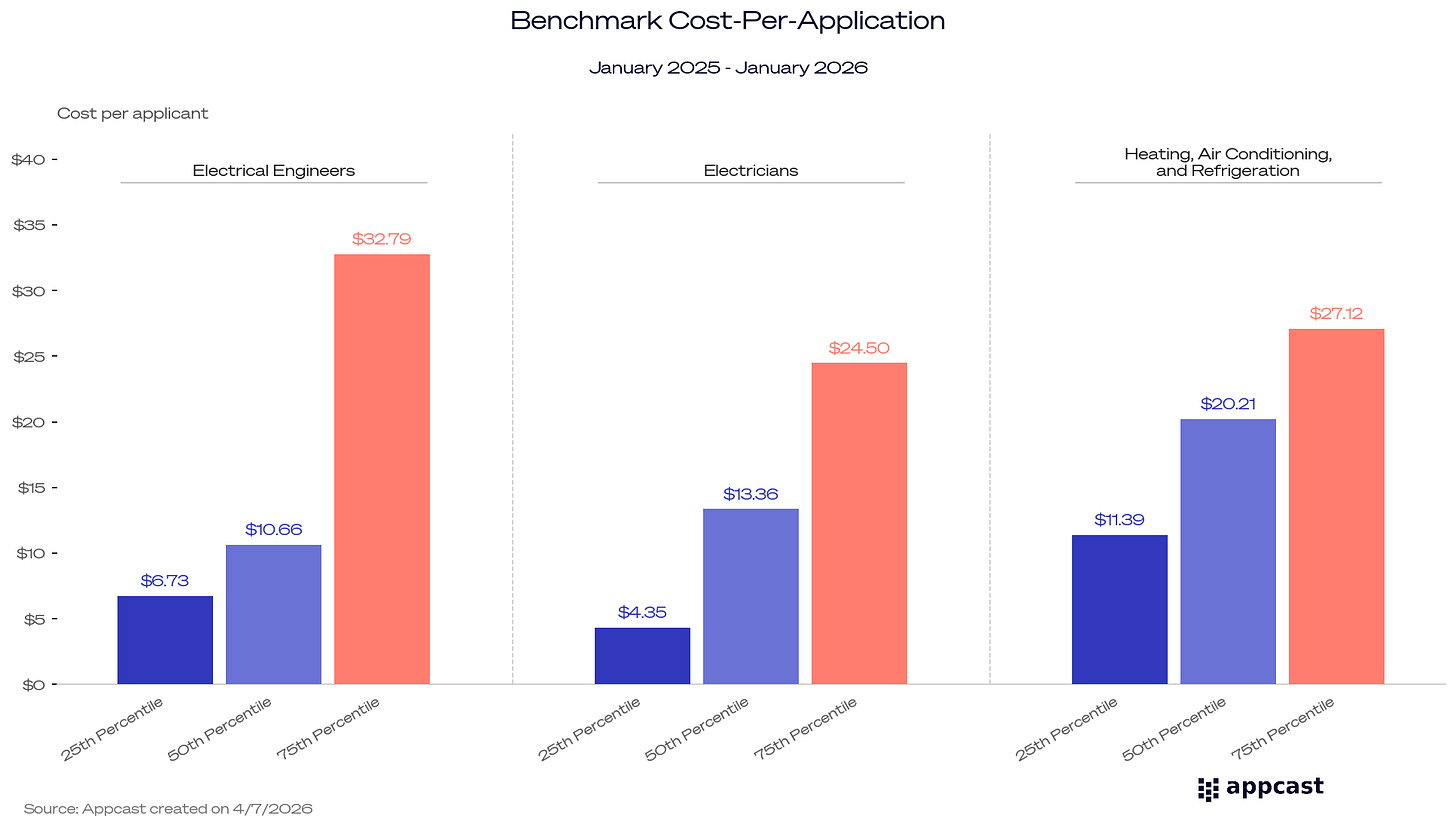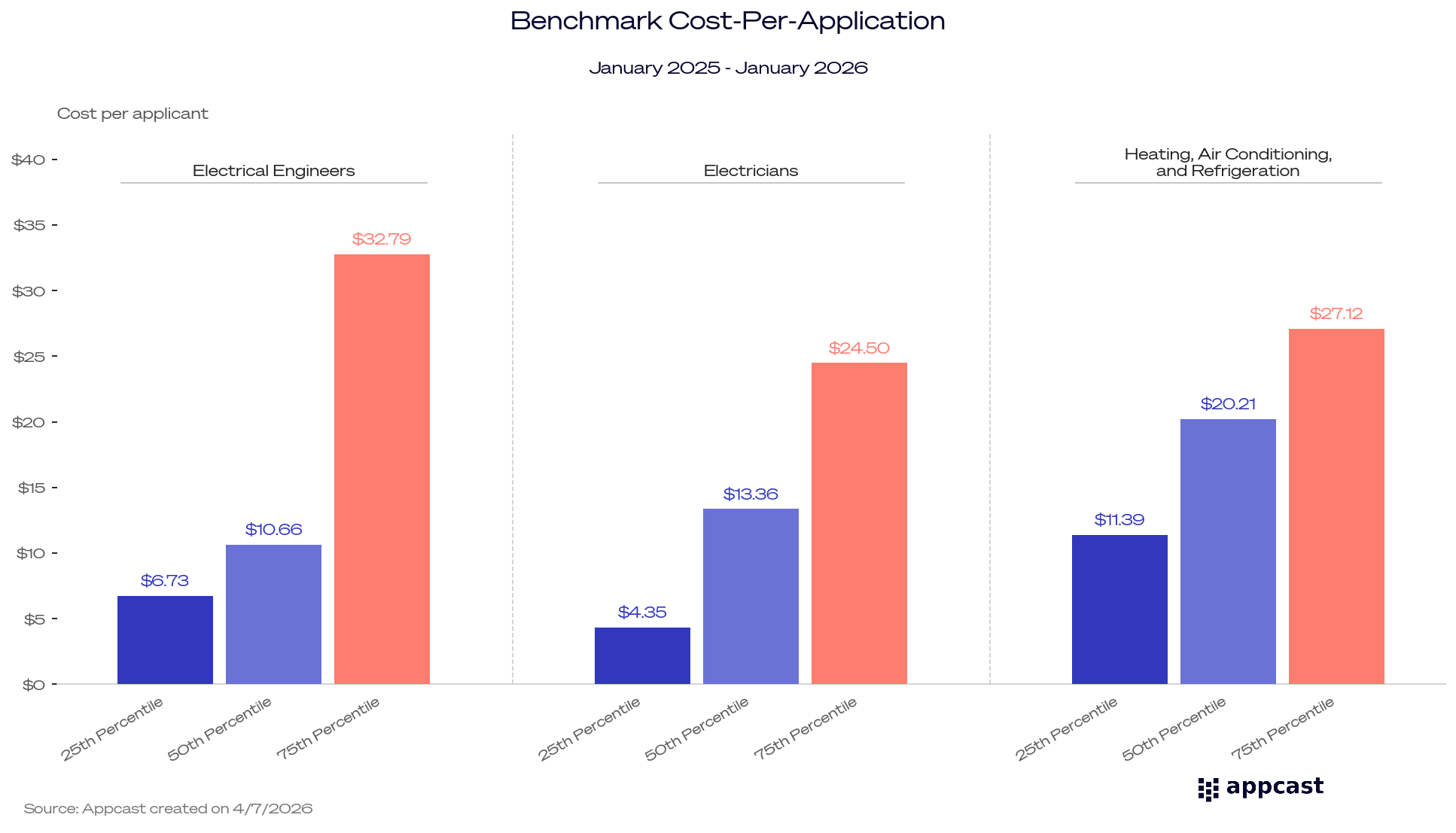 Across the U.S., hundreds of thousands of trade and infrastructure roles remain unfilled, even as demand continues to grow. At the same time, more than half of data center operators report difficulty attracting and retaining qualified workers. These constraints are often most visible in hiring costs. Cost-per-application (CPA) increases sharply at higher percentiles (especially for electrical engineers and skilled trades), reflecting intensified competition for scarce talent. As market pressure builds, employers must invest more to attract candidate attention; and in more competitive regions, CPA rises quickly as companies contend for a limited pool of qualified workers. In practice, this variation can be dramatic: some smaller or more constrained labor markets see CPA climb into the $60+ range, while major metropolitan areas like Chicago or Los Angeles can remain below $10, reflecting fundamentally different levels of competition for talent.