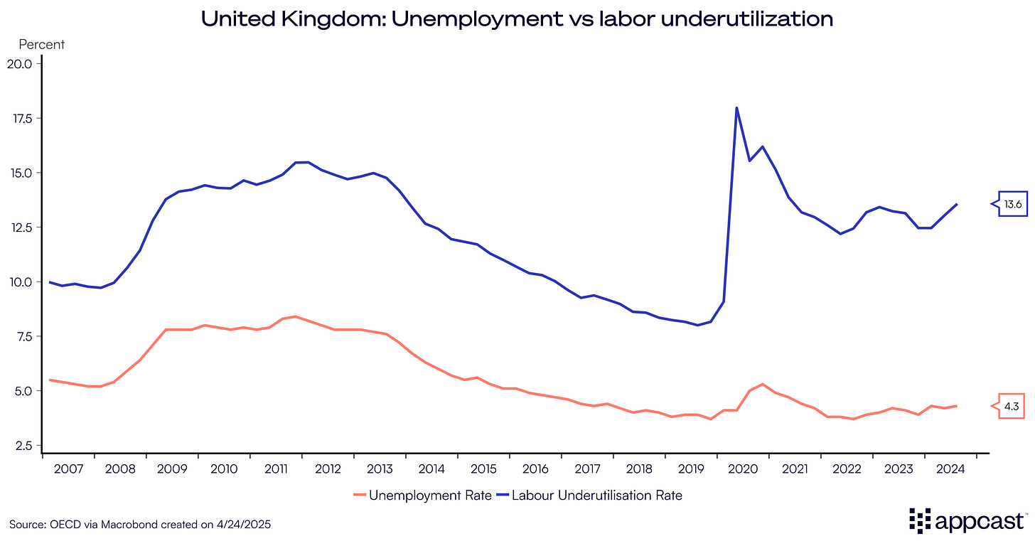 Even as the unemployment rate has increased by more than 0.6 percentage points since 2022, the current rate of 4.3% is historically low. However, unemployment is not the best measure of labor market slack or tightness anymore. Some of these alternative indicators suggest that the U.K. labor market is weaker than what the headline unemployment rate suggests.