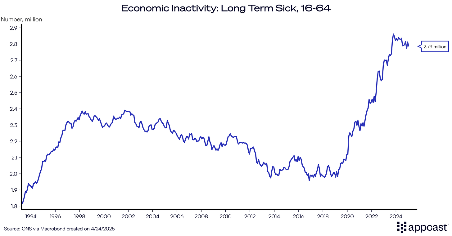 For those already facing economic hardship, the combination of inadequate unemployment support and a more stable financial safety net through sickness benefits has created a strong incentive to transition toward the latter. While many claims are legitimate, this trend highlights a broader issue in the U.K.’s welfare system that has pushed workers out of the labor force and into hidden unemployment. This is exactly why the Labour government recently announced to make changes to welfare entitlements to address the rapidly rising health-related benefit claims.
