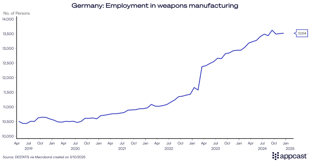 For example, Rheinmetall recently announced that it will repurpose two production plants that were previously producing car supplies to produce weapons instead. While weapons manufacturing employs less than 14,000 workers, the entire defense sector employs more than 100,000.